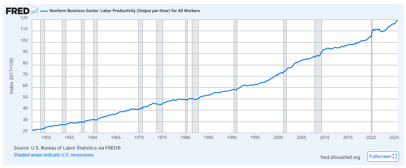 The figure below shows output per hour of work (i.e. labor productivity) in the US from 1947 – 2026. It is a steady, increasing line with no clear and obvious technological advancement visible. Computers, hard drives, microchips, laptops, the internet, cell phones, emails, microsoft office—all quietly integrated. The only jumps are around recessions, when output recovers before employment does.